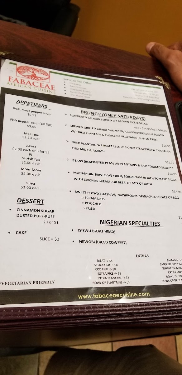 Welcome to Fabaceae African Cuisine Inc., your go-to destination for authentic Nigerian flavors in Houston. Located at 6720 Chimney Rock Rd, this gem specializes in a traditional menu that celebrates the rich culinary heritage of West Africa.